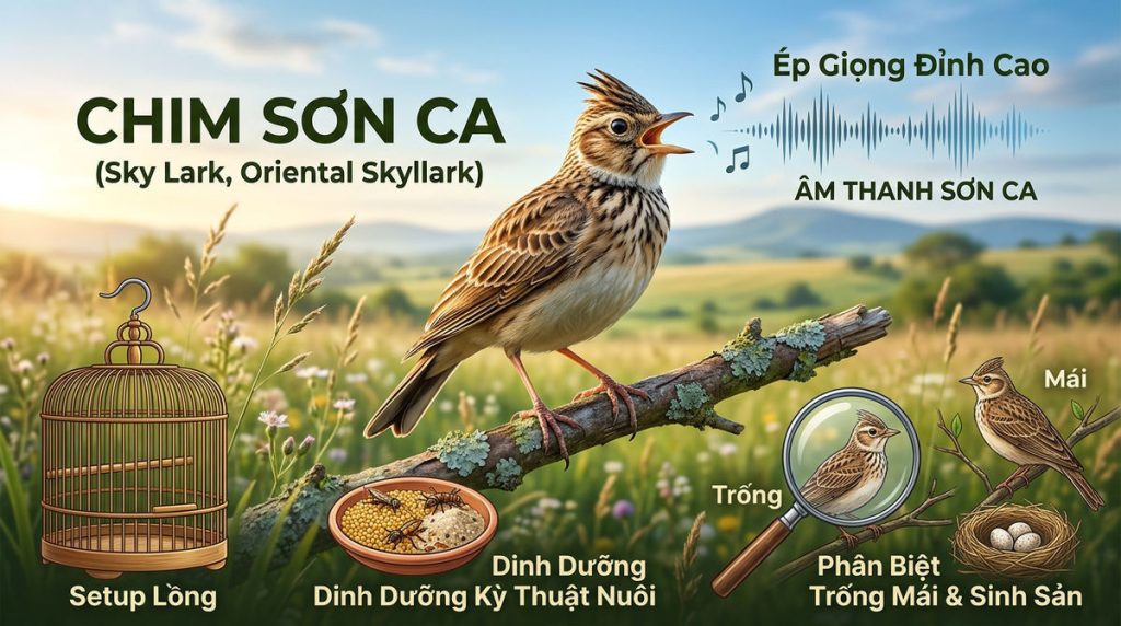 Bạn có biết sơn ca là loài chim duy nhất vừa bay vút lên không trung theo phương thẳng đứng, vừa cất tiếng hót ngân vang như một bản giao hưởng bất tận giữa bầu trời? Hình ảnh một sinh linh bé nhỏ chao lượn giữa tầng không, thả xuống những chuỗi âm thanh luyến láy, réo rắt đã làm say đắm biết bao thế hệ người yêu chim cảnh. Tuy nhiên, để thuần hóa một chú sơn ca bổi từ hoang dã, huấn luyện chim ‘lên nấm’ với tư thế oai vệ và ép được một chất giọng có hồn, đa âm sắc lại là một nghệ thuật đầy thách thức. Đó là một chặng đường đòi hỏi sự kiên nhẫn tột độ và kỹ thuật chuyên sâu mà không phải nghệ nhân nào cũng tường tận. Bằng những kinh nghiệm đúc kết từ thực tiễn, chúng ta sẽ cùng nhau bóc tách toàn bộ bí quyết từ A-Z, giúp bạn nắm vững cách thiết kế không gian sống, chuẩn bị dinh dưỡng, phân biệt trống mái và đặc biệt là tuyệt chiêu ép giọng sơn ca đạt đến độ đỉnh cao nhất.