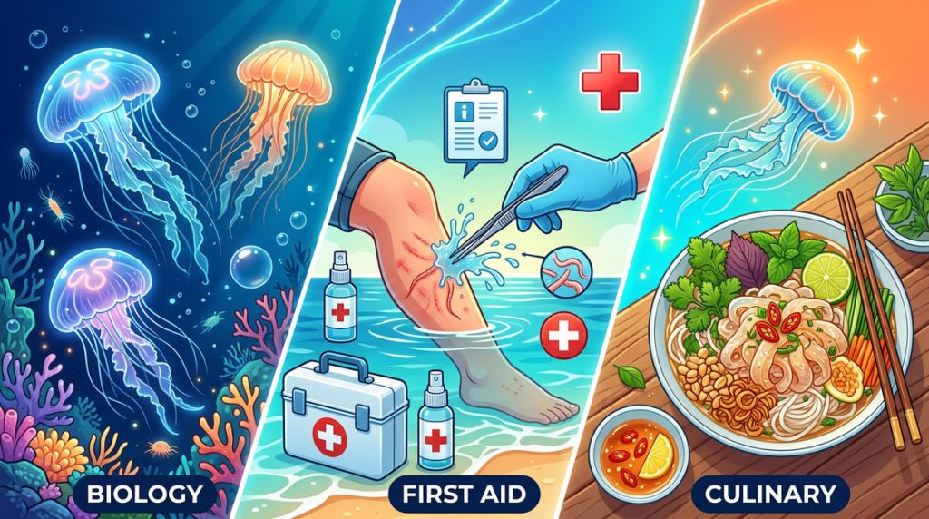 Bạn có biết sứa biển đã tồn tại hơn 500 triệu năm, vượt qua cả ba cuộc đại tuyệt chủng trên Trái Đất, mang trong mình một cơ thể không có não, không tim hay một giọt máu nào, nhưng lại sở hữu những vũ khí sinh học chết người và khả năng phát sáng kỳ diệu dưới đáy đại dương? Sinh vật tưởng chừng như mỏng manh, trôi dạt vô định này thực chất lại là một trong những kẻ sinh tồn vĩ đại nhất của tự nhiên. Tuy nhiên, sự thiếu hiểu biết về loài sinh vật này khiến nhiều người hoang mang tột độ, không biết cách xử lý chuẩn y khoa khi vô tình bị sứa đốt lúc tắm biển, hoặc e ngại mùi tanh, cảm giác ngứa ngáy khi muốn tự tay chế biến các món ăn từ sứa. Hành trình khám phá dưới đây sẽ giải mã toàn bộ đặc điểm sinh học, vòng đời của sứa, cung cấp phác đồ sơ cứu an toàn khi bị sứa độc tấn công, đồng thời bật mí kỹ thuật sơ chế sứa giòn ngon tuyệt đối cho các tín đồ ẩm thực.